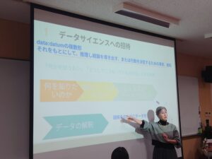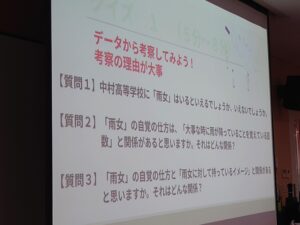 今回のテーマは「データサイエンスへの招待」。生徒たちは「あなたのクラスに雨女はいますか?」というユニークなミッションに挑戦しました。事前に実施したアンケート調査の結果をもとに、クロス集計されたデータやグラフを読み解きながら、グループごとに活発な議論を行いました。