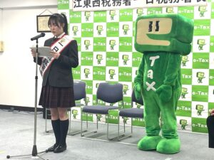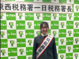 また12月9日(火)に東京国税局管内納税貯蓄組合連合会優秀賞を受賞した1名の生徒が、江東西税務署の「1日税務署長」として招待されました!税務署長として館内の視察・名刺交換・税務署職員の前での作文の朗読やインタビューなど、税務署長として多くの公務を行いました!