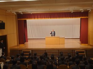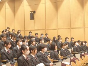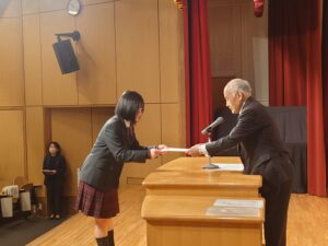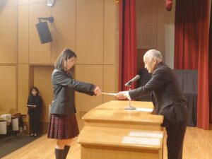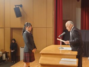 2月7日(土)に、中学3年生は「高等学校入学許可証授与式」を実施しました。中学3年生が高等学校の課程へと進む節目の式として、会場には引き締まった雰囲気が漂っていました。式では、遠藤校長より各コースの代表生徒に入学許可証が授与されました。証書を受け取る生徒たちの姿からは、義務教育を終え、いよいよ高校生として新たな学びに向かう自覚と決意が感じられました。