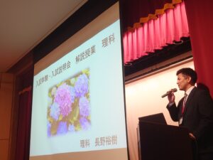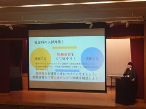理科と社会の教科主任が入試問題の解説とともに今後おさえてもらいたいポイントを伝えました。